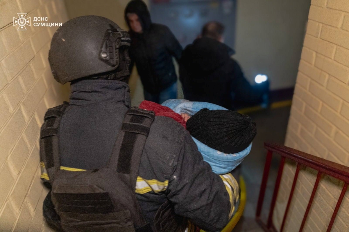 Рятувальник виносить дитину з палаючої будівлі після обстрілу РФ.