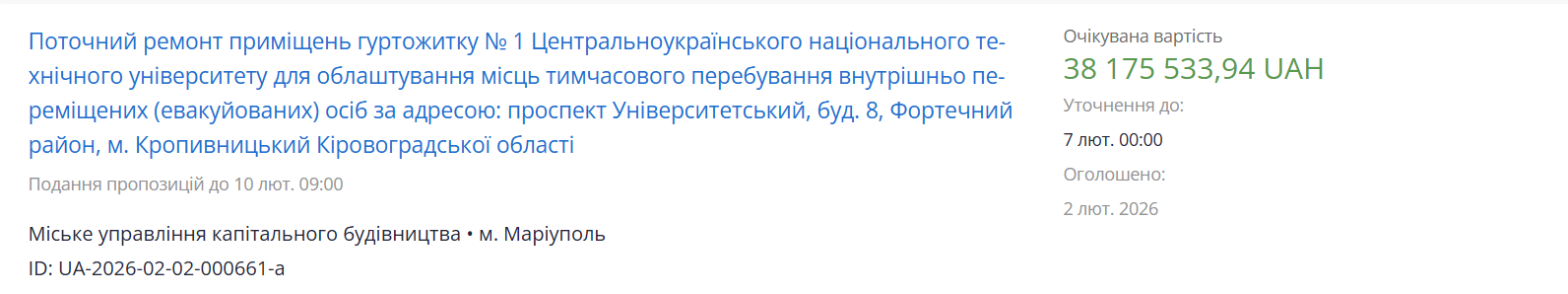 Крайній термін подання тендерних пропозицій призначено на 10 лютого. Це вже не перший тендер на ремонт будівлі. У лютому 2025 року Управління капітального будівництва Маріупольської міської ради оголошував аналогічний тендер на суму понад 55 мільйонів гривень.