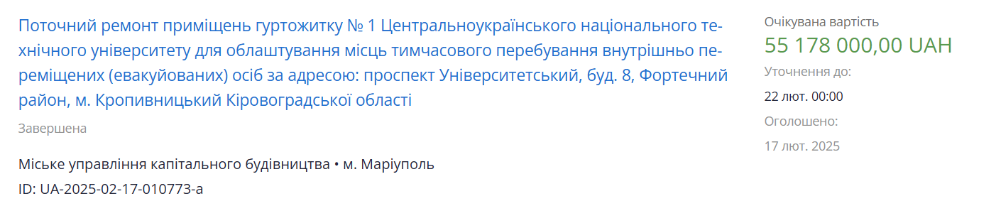 У Кропивницькому Кіровоградської області планують провести поточний ремонт гуртожитку №1 Центральноукраїнського національного технічного університету, який після оновлення використовуватиметься для тимчасового проживання внутрішньо переміщених та евакуйованих осіб із Маріуполя.