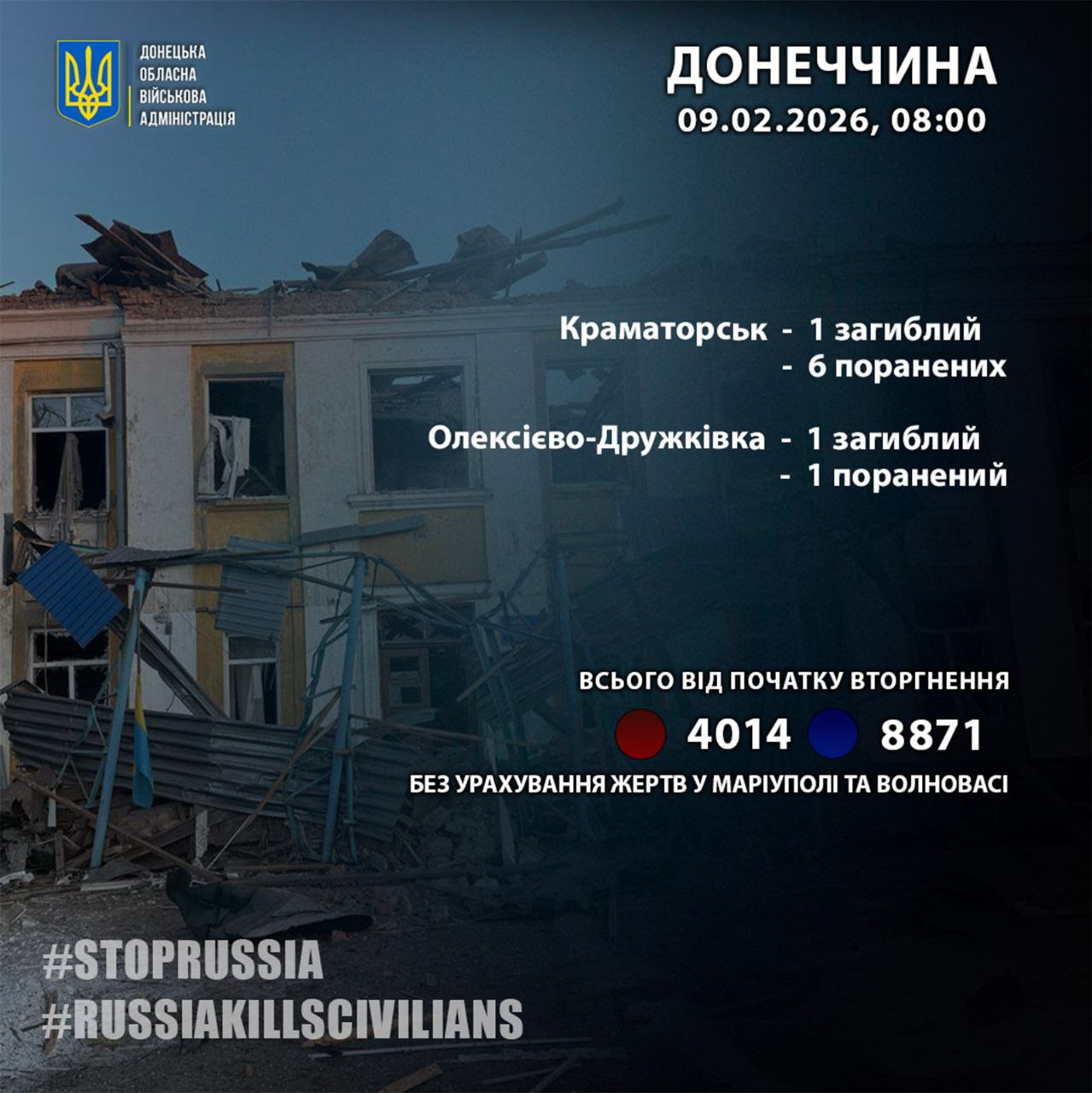 За 8 лютого в результаті російських обстрілів на Донеччині загинули двоє мирних жителів — у Краматорську та Олексієво-Дружківці. Про це повідомили у Донецькій обласній військовій адміністрації.