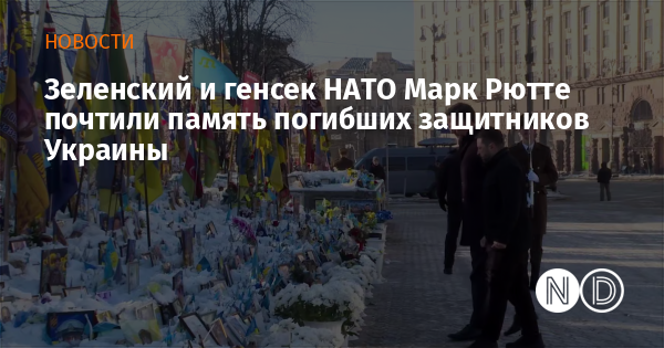 Президент Украины Владимир Зеленский и генеральный секретарь НАТО Марк Рютте посетили народный мемориал национальной памяти на Майдане Независимости в Киеве, где почтили память погибших украинских защитников и защитниц.